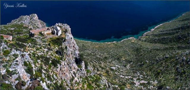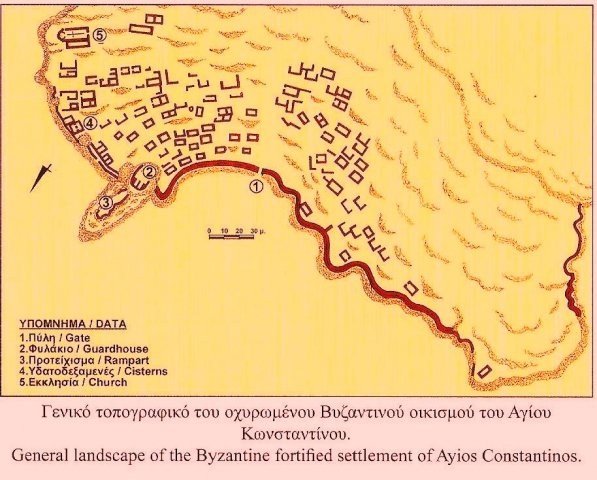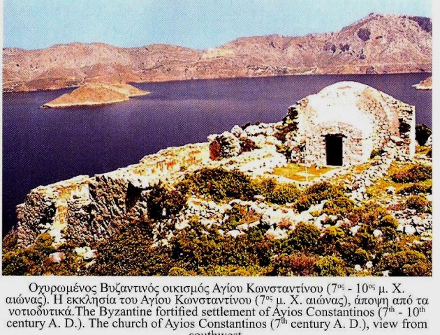The fortified settlement of Ayios Konstantinos (7th- 10th century) is built on the north mountainous slope of the island. It is accessible by two ways. Via footpath, this begins westwards of the church of Ayios Vassileios and leads to Ayios Konstantinos after an hour of walk. The second and easier is by ship, which leaves the visitors on a small bay. From there it's a sort walk to the Byzantine fortified settlement, with houses, cisterns, fortified walls and the ruined church of Saints Constantine and Helen. At the Holy Bema a unique fresco with a cross, decorated with painted jewels (7th cent.) still stands today.